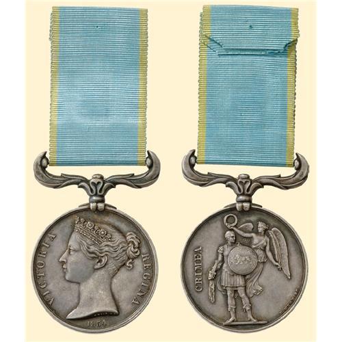Crimea Medal 1854; silver, Queen Victoria profile ("Wyon"), unnamed, with ornamental swivel suspension, with old ribbon. Very good condition with very few contact marks.