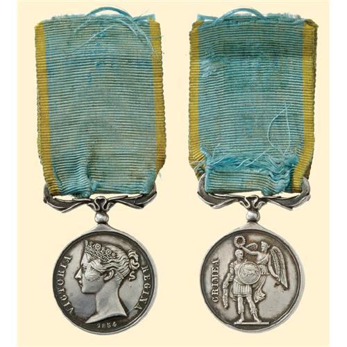 Crimea Medal 1854; half size reduced model, silver, diameter 23 mm, Queen Victoria profile, unnamed, with ornamental swivel suspension and old ribbon. Some metal corrosion and one edge knock.