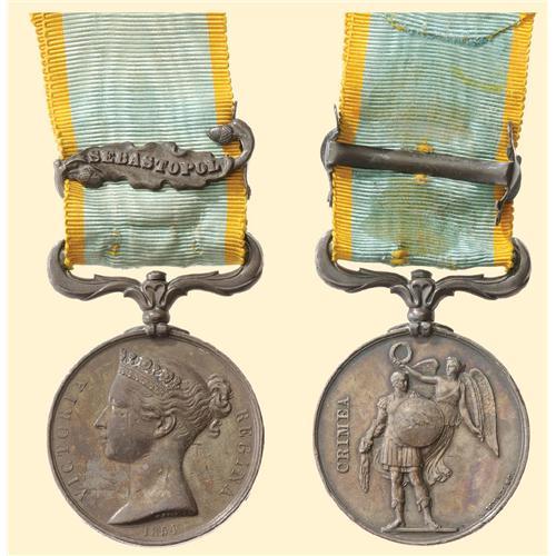 Crimea Medal 1854; silver, Queen Victoria profile ("Wyon"), unnamed, with ornamental swivel suspension and one clasp "SEBASTOPOL" on original old ribbon. Fine old dark patina, small signs of age and contact marks!