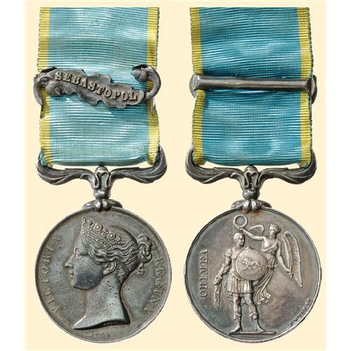 Crimea Medal 1854; silver, Queen Victoria profile ("Wyon"), unnamed, with ornamental swivel suspension and one clasp "SEBASTOPOL" on original old ribbon. Fine old patina, contact marks and one edge mark.