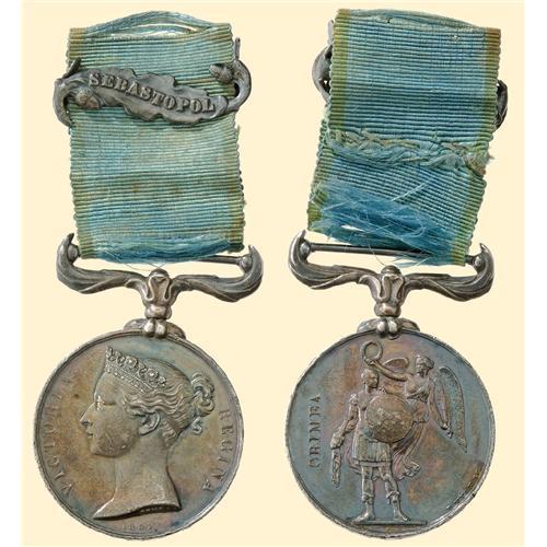 Crimea Medal 1854; silver, Queen Victoria profile ("Wyon"), named "VOLLAND, 4327, 18 DE L(igne)", with ornamental swivel suspension and one clasp "SEBASTOPOL" on original old ribbon. Fine old patina, contact marks and edge knocks.