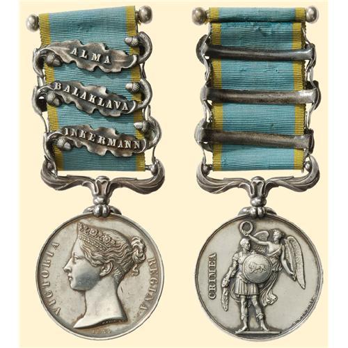 Crimea Medal 1854; silver, Queen Victoria profile ("Wyon"), unnamed, with ornamental swivel suspension and three clasps "ALMA", "BALAKLAVA", "INKERMANN", with ribbon. Some contact marks but a very fine piece!