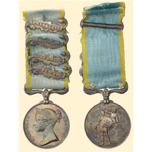 Crimea Medal 1854; silver, Queen Victoria profile ("Wyon"), unnamed, with ornamental swivel suspension and four clasps " BALAKLAVA", "SEBASTOPOL", "INKERMANN", "ALMA ", with old original ribbon. Small signs of contact and wonderfull patina!