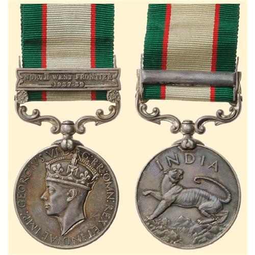 India General Service Medal - George VI, silver, named "7648 SEP. AKBAR KHAN. TOCHI SCOUTS." with "NORTHWEST FRONTIER 1937-39"-clasp and original ribbon. Beautifull dark patina and very fine condition.
