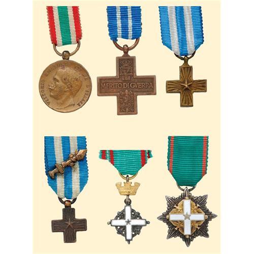 Lot of 6 miniatures with ribbon. 3 Merito di Guerra Croce (1 with sword on ribbon), 1 Unita d'Italia