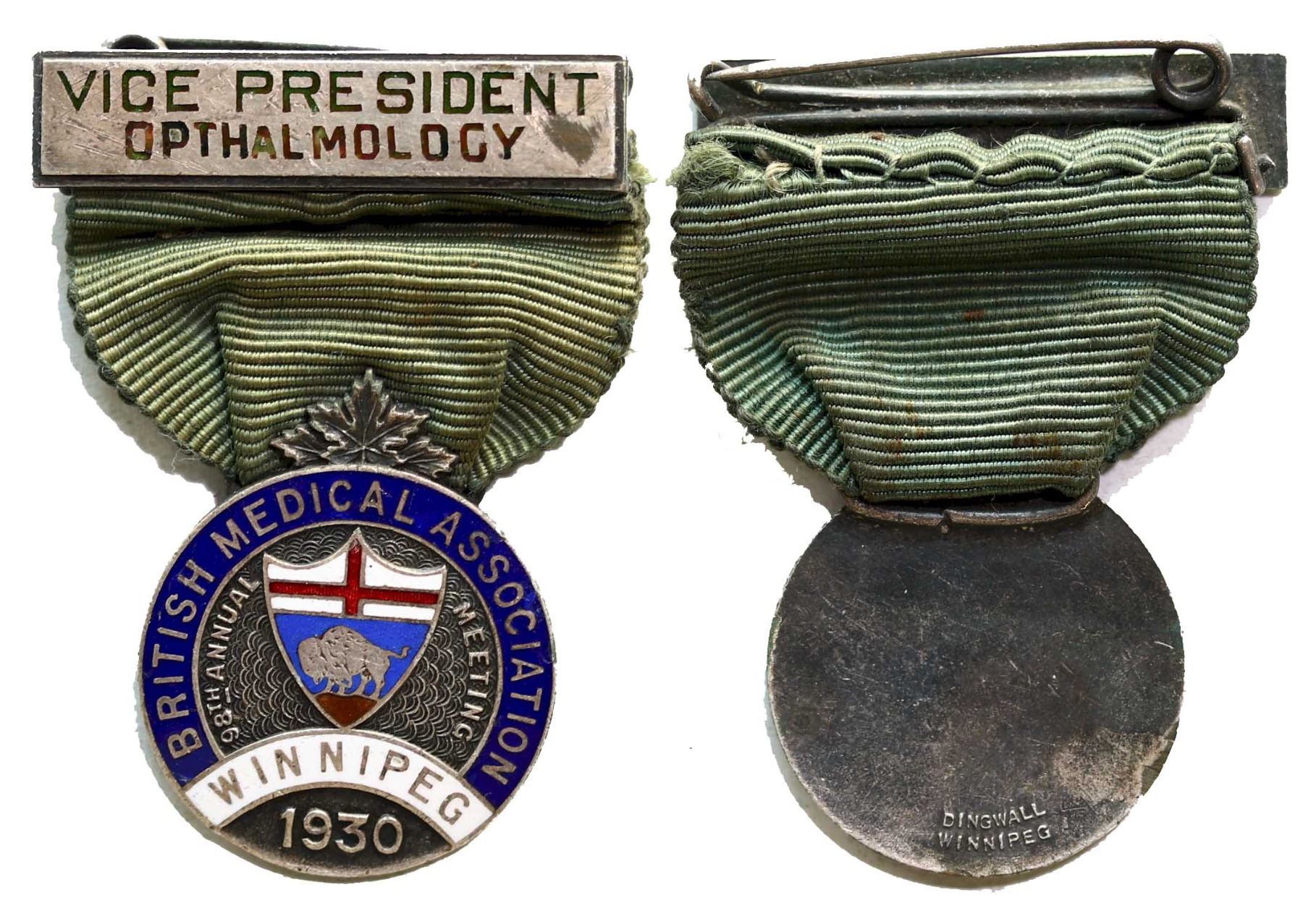 Medal: In August 1930, Winnipeg hosted the 98th annual meeting of the British Medical Association (BMA). With its cultural performances, art exhibits, scientific displays, and countless medical presentations, the BMA annual meeting was one of the most celebrated events in Manitoba medical history. Four vice-presidents of the Faculty of Ophthalmology were present at the 1930 meeting, including two from Canada.