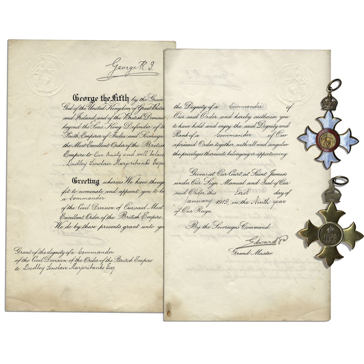 Medal honoring the Commander of The Most Excellent Order of the British Empire, accompanied by the bestowal document. Commanders' breast badge is of the first type, made in the shape of a cross fleury with ice blue enamel over guilloche limbs. At the center is a gold or bronze medallion depicting an enthroned figure in profile with sun in the sky, surrounded by a red enamel border reading, ''For God And The Empire''. Medal is topped with an articulated openwork crown attached to a loop for suspending. Verso bears the monogram of George V as ''G.R.I.'', George Rex Imperator. Accompanied by its 12'' x 1.75'' purple grosgrain ribbon and document bestowing the medal on the new commander, Dudley Sinclair Marjoribanks, Esq., with facsimile signature of George and signed on the second page, ''Edward P''. Medal measures 2.5'' x 3.75''. Near fine. Ribbon shows fraying to the top, else near fine. Document runs 2pp. on a sheet of card-style stationery, measuring 8'' x 12.75''. Toning, else near fine.