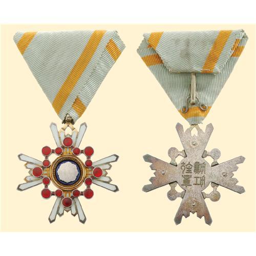 Knight`s Cross - 5th Class (?); breast badge, silver, signs of gilding on short rays, obverse enamelled, reverse blank with Japanese inscription, with original triangular ribbon. Mint state!