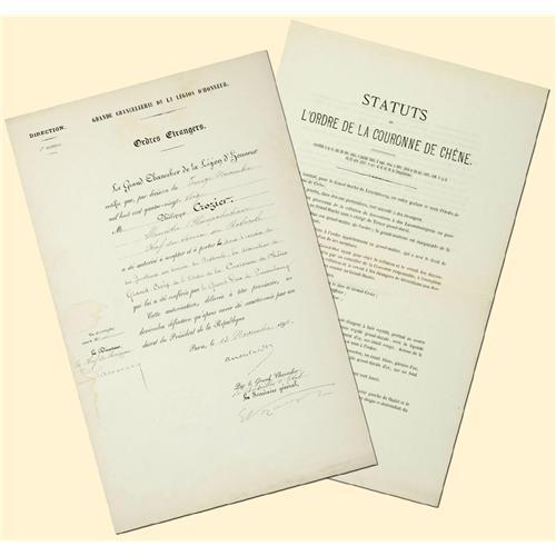 Legion of Honor, dated Paris, November 1896. With connecting official text of statutes of the order of