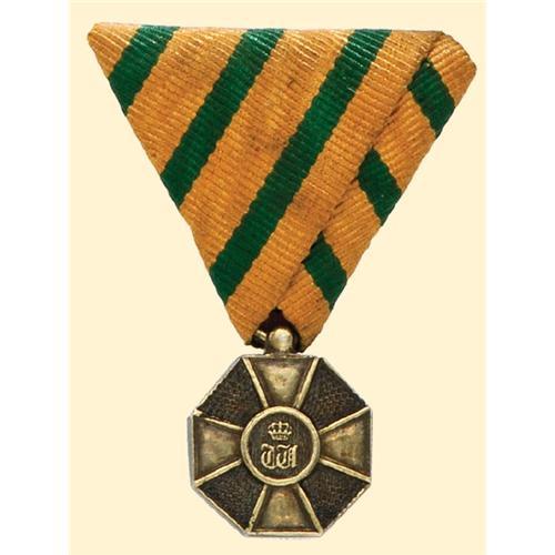 Miniature of 1st class medal of the Oak Crown. In silver-gilt with trifold ribbon.