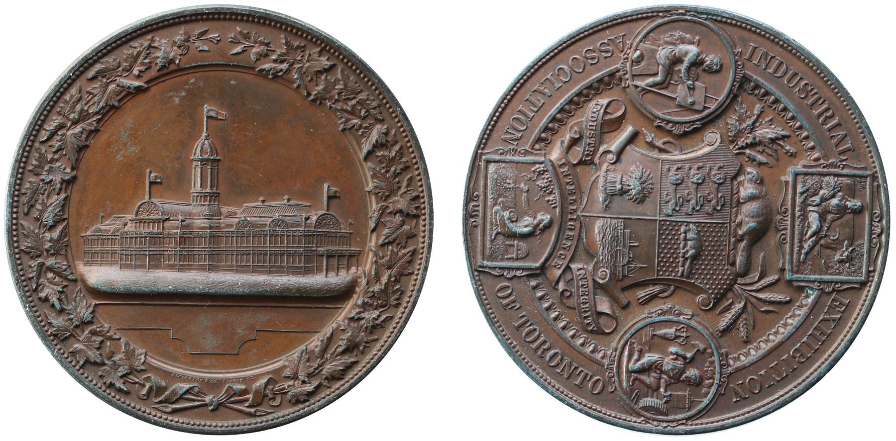 Medal; Leroux 1464 - 1880 Industrial Exhibition Association of Toronto (CNE) Medallion. Obv,: Arms of the City of Toronto, Rev,: Exhibition palace in a wreath of maple leaves, Without the words, 64mm