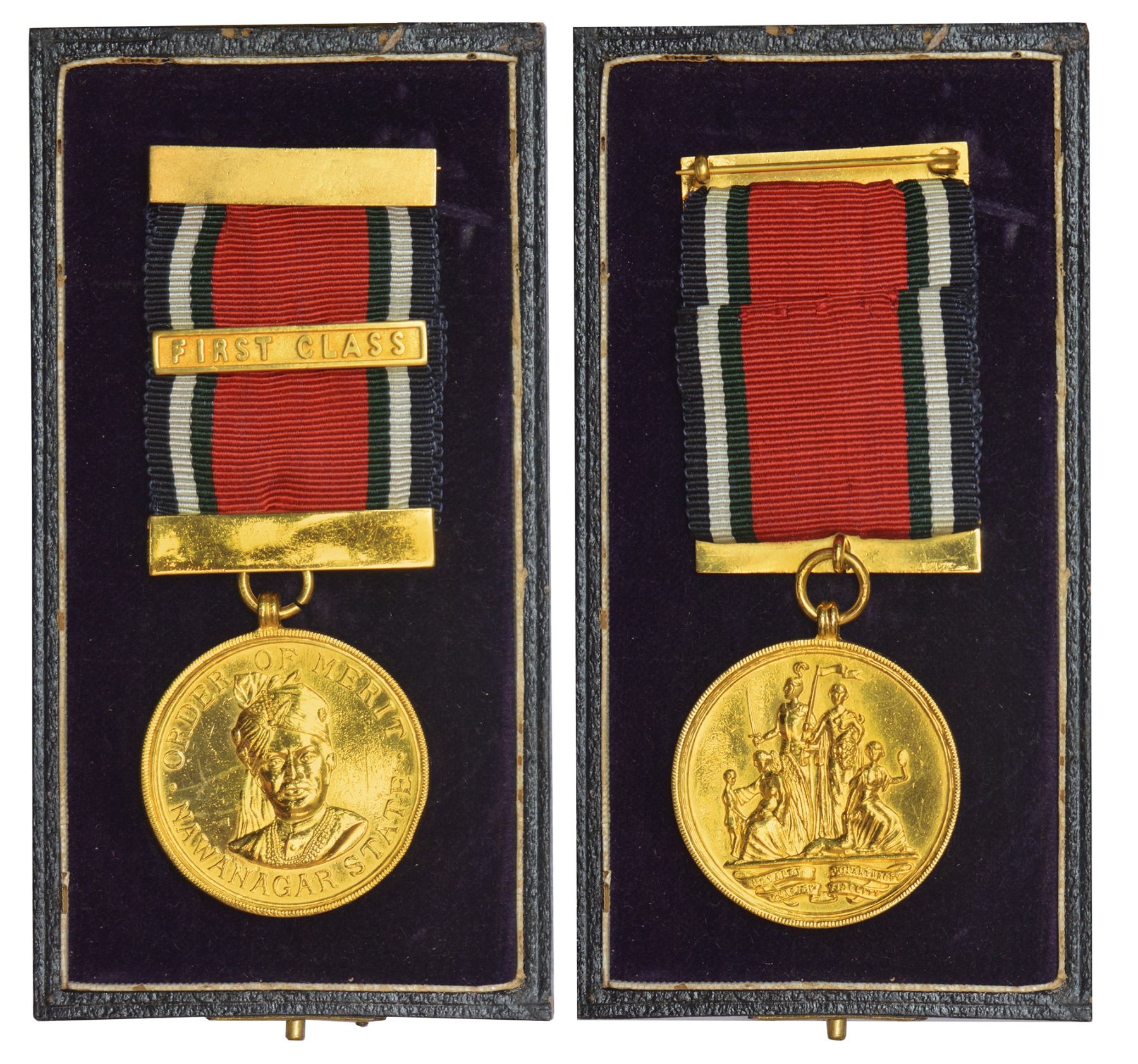 Nawanagar, H.H. Shri Sir Ranjitsinhji Vibhaji II-Jamsaheb of Nawanagar, FIRST CLASS, gold medal, 28.51g. Obv: Portrait bust of Sir Ranjitsinhji, inscription above portrait ORDER OF MERIT below NAWANAGAR STATE. Rev: Two standing figure (a knight and justice) and four seated (angel with child, beauty with dog), below on four scrolls LOYALTY/PHILANTHROPY/CHARITY/FIDELITY, McClenaghan 203.