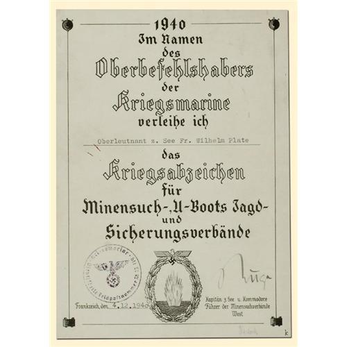 Awarding Document for the Mine-Sweeping-Badge. Small size document (A5) for Oberleutnant Z.