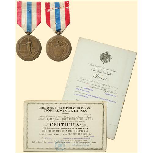 Solidarity Bronze Medal 1919; breast badge, bronze, obverse: "PATRIA - LA FORZA DEL DERECHO", reverse: "1917-1918", by M. Lordonnois, original suspension ring and ribbon, together with Spanish language document in horizontal format for the 2nd Class award to a Romanian colonel and commander of an Infantry brigade, dated and signed in Paris, 1919 and the Romanian document authorizing permission to wear the award. Some folds, signs of age. The Republic of Panama took part in World War I on side of the Allies! An extremely rare medal of high interest with a complete set of award documents!