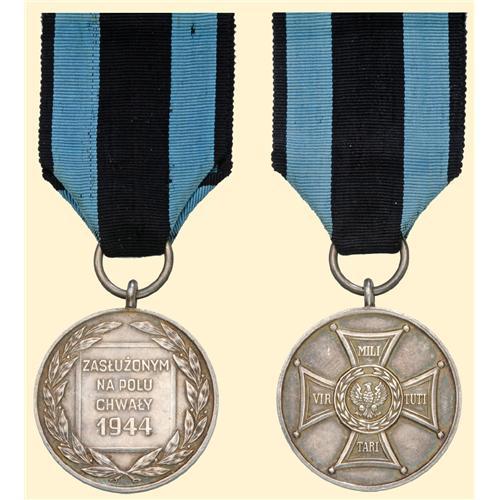 Silver Medal of the Order of Virtuti Militari, type 1944, diameter 40 mm, silver, with French swan`s-mark, with original ribbon. Very fine.