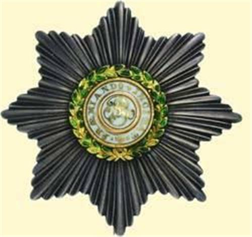 Breast Star - II. Type in ? size; silver, smooth rays, centre medallion gold and enamels, diam.: 54 mm; thin version with thin gold pin on reverse; hallmarked "anchor" and "H" (maker's mark ?). Excellent old quality from about 1830 in very fine condition, a few enamel damages in green wreath.