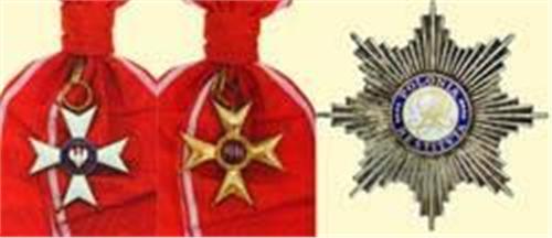Grand Cross Set - II. Type (1944); sash badge, bronze gilt, obverse enamelled, reverse medallion "1944" enamelled, with grooved suspension ring, with original complete sash; breast star, bronze silver plated, superimposed medallion gilt and enamelled, diam.: 77 mm, smooth reverse with thin pin; some patina.