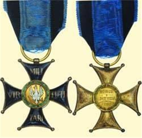 Knight's Cross (3rd class) - Type 1918-1939; breast badge, silver gilt, obverse enamelled, with separately set medallions, inscription on reverse "HONOR I OJCZYZNA / 1792", numbered "16", with large suspension ring and old tattered ribbon. Small signs of wearing, small enamel damages. Very fine original quality!