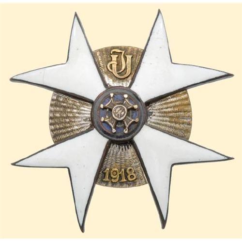 Bronze silver plated and patinated, cross averse enamelled, three parts construction, size 47,2 x 47,2