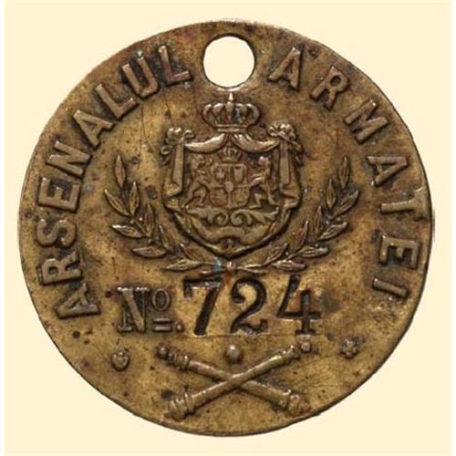 Identification mark for the Army Arsenal, No 724, round form, old Romania Coat of Arms before 1924, wreath of laurel and crossed gun barrels, bronze.