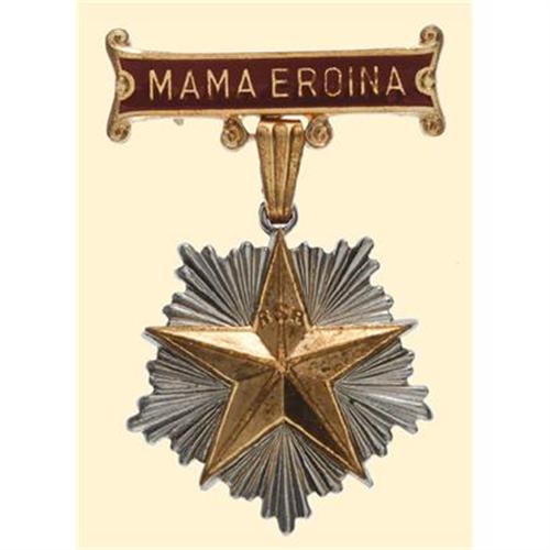 Breast Badge, gilt star with "R.S.R." on silvered rays, with original suspension ring and original red enamelled metal bar with pin back and "Mama Eroina" ("Heroic Mother") legend. Awarded to mothers with more than 10 children. Rare!