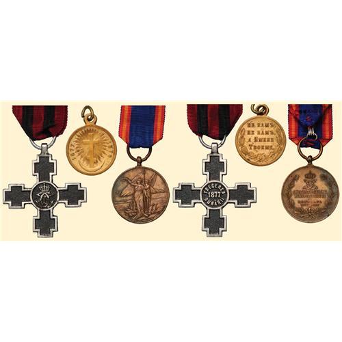 The "Defenders of the Independence" medal, instituted on June 5th, 1878, commemorative award for all participants and activities during the Independence War, either in, or on behalf the armed forces. Breast Badge, bronze, on reverse the engraver's mark, E. Falot, with original ribbon; "Russian commemorative medal of the 1877-1878 war", awarded by Tsar Alexander II to Romanian military troops who fought in the battles of Pleven, and included among war medals in the Romanian Hierarchy, by the High Decree 2141 on September 18th, 1878. Breast Badge, bronze; The "Crossing of the Danube" cross, instituted on March 23rd, 1878, commemorative award for all military and civilian personnel who participated in the 1877-1878 campaign and operated across the Danube. Breast Badge, bronze, with original ribbon. Very interesting set of old decorations, in a very good condition.
