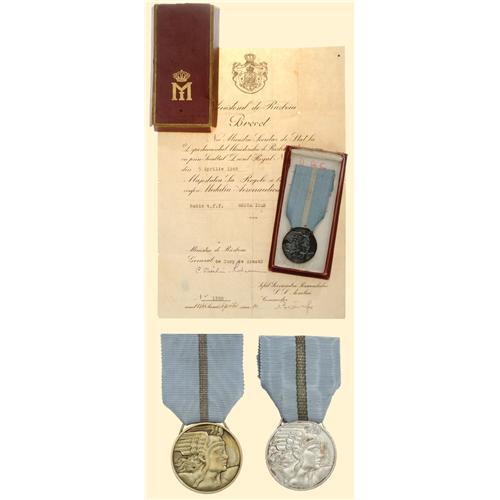 Medal of Aeronautical Virtue, for civil, complete set of three classes; 1st Class gilt, 2nd class silvered and 3rd Class in bronze in original case of issue, together with rare awarding document for a radio operator, the 5th of April 1946, all three with original ribbons. Rare and interesting extremely fine condition set! The medal was instituted in 1931, to reward the merits of air personnel and troops.