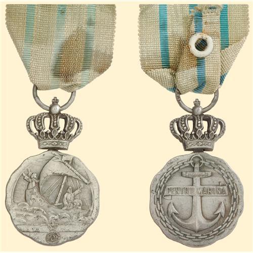 2nd Class with crown, 1st model, for navigating personnel, awarded for merits in time of peace, breast badge in silver with crown, hallmarked "10-27", maker`s mark "HW" and cipher of Carol II, with original worn ribbon. The medal was instituted in 1936, first as the Maritime Medal and was subsequently changed by royal decree in 1938 into Medal of Maritime Virtue. It was awarded in recognition of bravery and valor. The medal was organized in three classes, 1st class gilt, 2nd class in silver and the 3rd in bronze and two models, for navigating personnel, bearing a crown, and for non-navigating personnel, without crown. After 1938 it could also be awarded for merit in war, with swords under the crown in all three classes. The obverse design is a sailing boat tossed by the waves and on the base of the medal, the king`s cipher. On the reverse is an anchor over which is superposed a ribbon bearing the legend "Pentru Marina" ("For the Navy"), all surrounded by a chain.