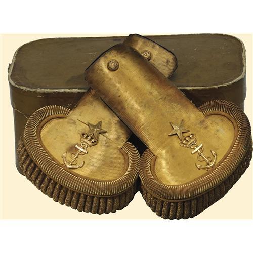 Evening uniform epaulettes for a navy captain rang 3 (major), model after the reorganization from 1921, silk and short fringes, anchor as sign of marine. With old delivery box. Very rare and in good condition.
