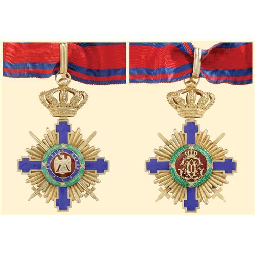 Commander`s Cross, 1st model (1877), for military in time of war; neck badge, silver gilt, both sides enamelled, original suspension loop and ribbon, applied swords to the centre. Very fine quality with small enamel cracks. Very rare!