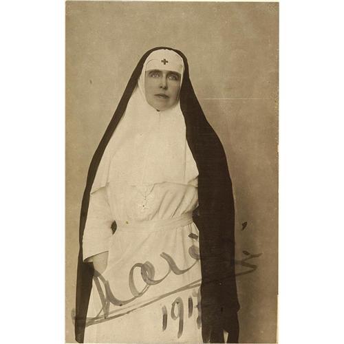 Queen Maria image in the Red Cross Nurse uniform, with the neck badge of "The Queen Maria Cross", original signature and the year 1917. Very interesting and rare !