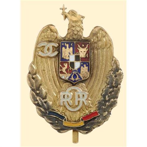 Badge, bronze gilt, partially enamelled, with king Carol II cipher, multipart construction, numbered on reverse "566", with pin and maker`s mark Carniol - Bucharest. High quality badge!