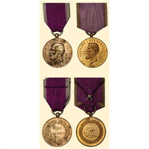 Instituted by Carol I, on February 20th, 1876, in two classes , to reward the merit in arts and science. Relative rarely awarded, and closed after the institution of "The Order for Cultural Merit" in 1931. The first model, breast badge, silver gilt, averse the portrait of Carol I and "Carol I Priceps Romaniae", awarded between 1876 and 1881, with original ribbon. The second model, copper gilt, averse the later portrait of Carol I and "Carol I Rex Romaniae", second model, awarded between 1881 and 1931, with original ribbon. Very interesting set!