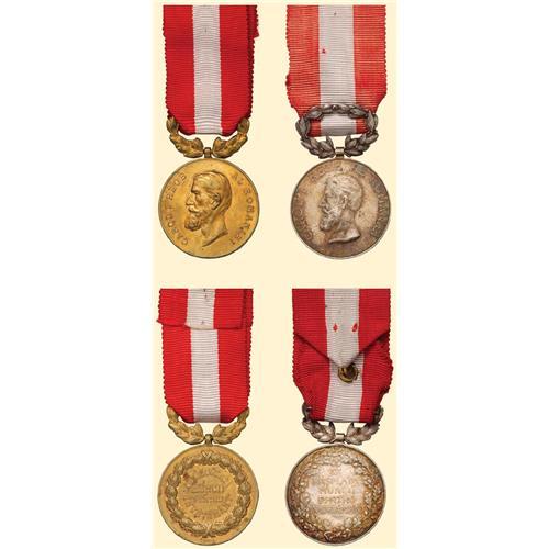 Instituted on October 2nd, 1898, by King Carol I, initially in two classes, to reward the primary school teachers, extended in the year 1900 to the secondary school teachers and after 1906 to the technical and trade schools. With a Royal decree from March 8th, 1907 the medal covered any sort of contributions to the advancement of national education and culture. The medal was closed in 1931, with the introduction of the "Order of The Cultural Merit". First class, breast badge, bronze gilt, on averse the portrait of King Carol I and the text "Carol I King of Romania". On reverse, the third and last definition of the medal, used for all forms of public education, surrounded by an oak leaves wreath. Suspension ring in the form of a wreath of laurel leaves. The maker's mark "Resch" on reverse. Second class, breast badge, silver, averse the portrait of King Carol I, different design, and the text on reverse in three rows. The suspension ring in the form of a wreath, but over the ribbon. Interesting set, with different maker's details, with original ribbons and in good condition.