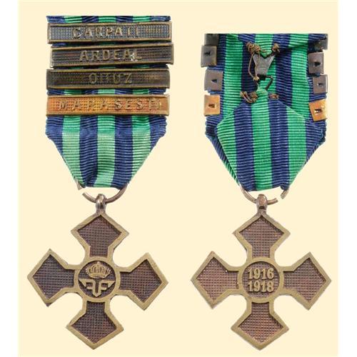 The Cross was instituted by Royal decree No 1744, on July 8th, 1918, to reward the military and civil services during the War of National Reintegration. Breast Badge, bronze, on averse Ferdinand I's cipher, on reverse the years 1916-1918, with original ribbon and four bars "Carpati, Ardeal, Oituz and Marasesti".