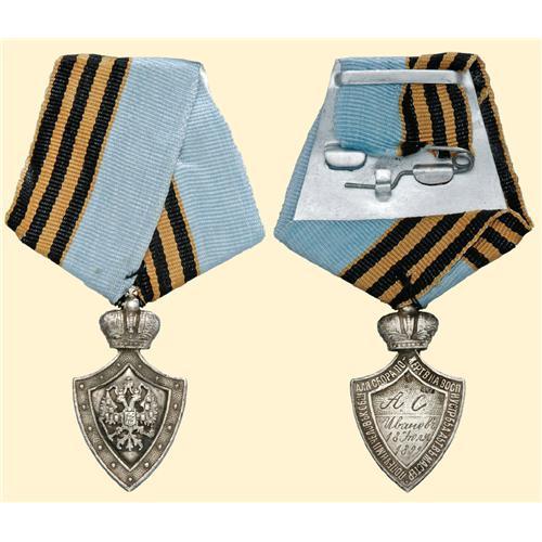 Token-Shield, crowned, silver, with superimposed Imperial eagle, old Russian hallmark ("84 Ja L"), dimensions 22.6 x 40.2 mm, inscription on reverse "A.S. Iwanowitch/18.July 1899" (in Cyrillic). With new ribbon clasp. Significant signs of wear. Werlich 822.