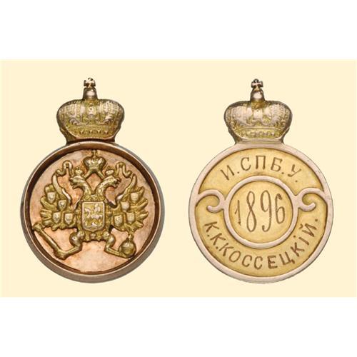 Small Crowned Medal, gold (22.5 x 32.3 mm, 6.5 g), separately inlaid Imperial eagle, inscription on reverse "I. SPB.U./1896/K.K.KOSSETZKIJ (in Cyrillic)". Tail feather of the eagle are missing. Small signs of wearing, very attractive! Cf. Werlich 719, W. - Jetons-168.