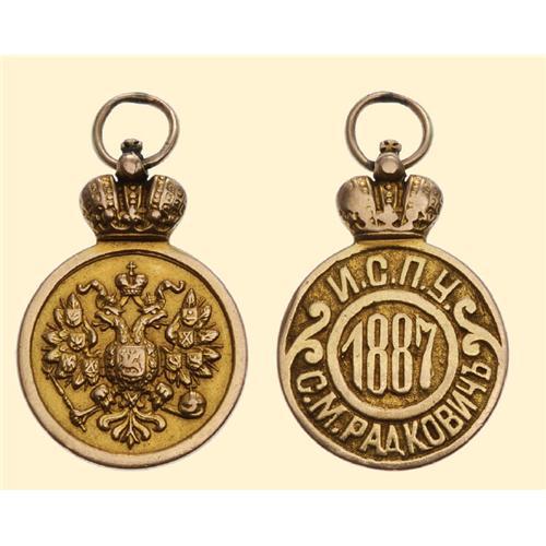 Small Crowned Medal, gold (diameter 19 mm, 4.9 g), inscription on reverse "I.S.P.U. (Imperial St. Peterburg University) - 1887 - S.M.RADKOWITCH"; with small suspension ring. Small signs of wear, very attractive! Cf. Werlich 719, W.Jetons J-168).