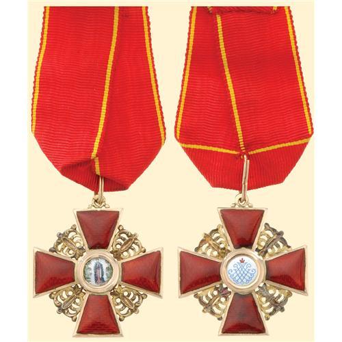 Cross, 3rd Class (Knight`s Cross); breast badge, gold, both sides enamelled, medallions are painted, old Russian hallmark (56 - Kokoshniks), maker`s mark (I.JA.) and Russian eagle mark with original gold hallmarked wire suspension loop and original ribbon. Very fine old quality!