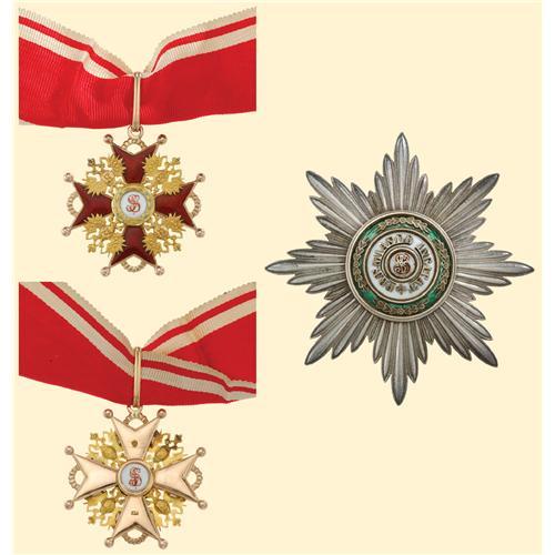 2nd Class set; neck badge, gold, obverse enamelled, medallions painted, old Russian hallmark (56 Moscow), maker's mark (AK) and Russian eagle's mark, with original suspension loop and ribbon. Excellent old original Russian pre-war quality in near best condition! Breast star, corpus silver with plain rays, flat version, medallion gilt and enameled, reverse slightly gilt, wide pin, old Russian hallmarks (84 - Kokoschniks), maker's mark (Keibel, A.K.). Minor damage in green enamel but very fine old Russian quality with fine attractive patina!