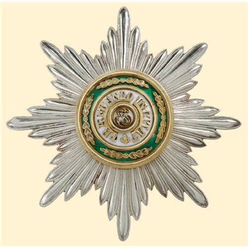 Breast Star, 1st Class; breast star, corpus silver with plain rays, significant high version, medallion gilt and enamelled; reverse gilt, wide pin, old Russian hallmarks (84 - Kokoschniks), maker's mark (Eduard, WA). Very fine impressive old Russian quality with a small crack in the green enamel.