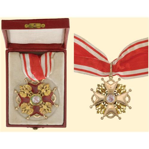Cross, 2nd Class; neck badge, gold, obverse enamelled, medallions painted, old Russian hallmark (56 - Kokoschniks), maker's mark (Edouard, WA); with original hallmarked suspension loop and long ribbon in case of issue. A perfect piece!