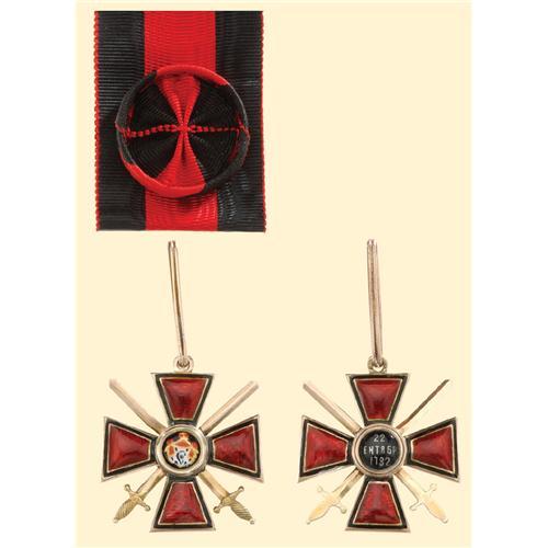 Knight`s Cross with Swords, 4th Class; breast badge, gold, both sides enamelled, obverse medallion partially painted, thick and vaulted version with crossed swords, diameter 38.5 mm, old Russian hallmarks (56 Moscow, Kokoschniks), maker`s mark "?"; with original long gold wire suspension loop and ribbon with rosette. Excellent old Russian quality of high attractivity, tiny signs of wearing!