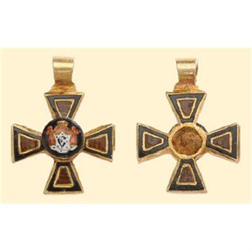 Miniature Badge of Saint Wladimir order. Very small version, gold, both sides enamelled. Reverse centre missing. Of excellent tiny quality!