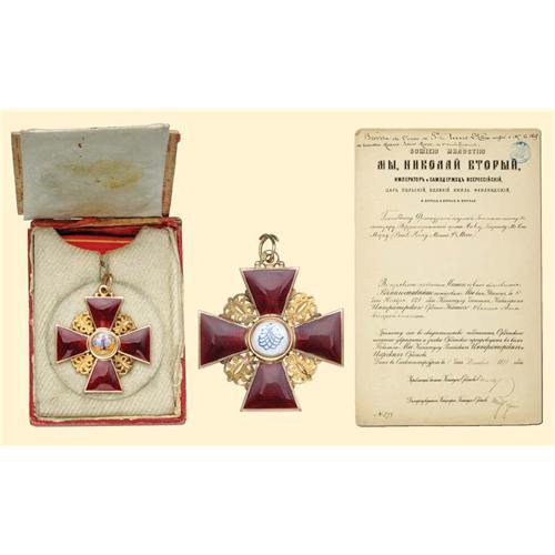 Cross of 2nd Class (Commander's Cross). Neck Badge, gold, both sides enamelled, medallions are painted, old Russian hallmark (56 St Petersburg), maker's mark (AK?) and Russian eagle's mark, diameter: 43,3 mm; with non original small suspension ring. With piece of original ribbon, in damaged old box. Excellent old Russian quality in near mint condition! Together with awarding document for 2nd class. Imperial Russian diploma to a French officer-commander of a battalion of the territorial army (Paul Henry Meaux St-Marc). Dated and signed in St-Petersburg on 1st of December, 1898. With two original signatures of Russian order's officials. In Russian language and Cyrillic script on four-sided sheet. Small signs of age.