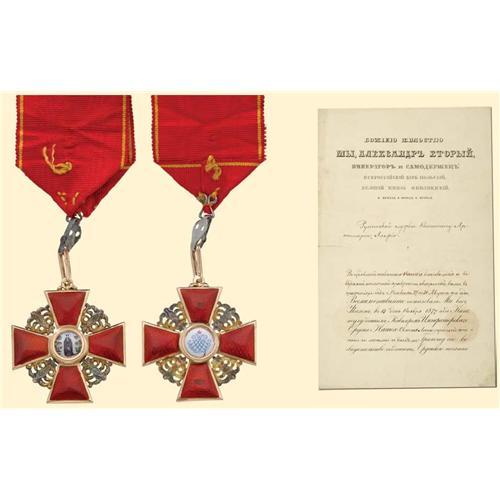 Cross 3rd Class (Knight's Cross). Breast Badge, gold, both sides enamelled, medallions are painted, old Russian hallmark (56 Kokoshniks), maker's mark (Eduard,?), with originally hallmarked gold wire suspension loop and original ribbon. Excellent old quality, but reverse medallion is cracked. Together with awarding document for 3rd class with swords and bow. Imperial Russian diploma to a Romanian artillery-captain. dated and signed in St-Petersburg on 28th of December, 1877. With four original signatures of generals and order's officials. In Russian language and Cyrillic script, red wax-seal is missing. Twice folded.