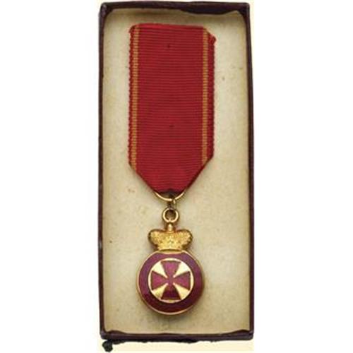 Badge 4th Class (Medal). Small crowned medal, bronze gilt, averse partially enamelled, reverse blank, one part construction; with suspension ring and piece of new ribbon; in small cardboard box. Probably post war exile production of high quality and mint condition.