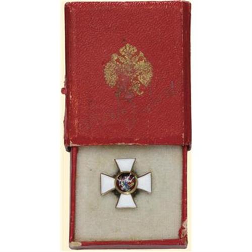 Miniature Cross for Swords of Honor. Gold, averse enamelled, separately mounted medallion painted on dark red background, diameter 16,8 mm; screw on reverse, old Russian hallmark (56 Moscow) and maker's mark "WA" (cyrill. BA); in original old small red cardboard box. Excellent old quality and condition!