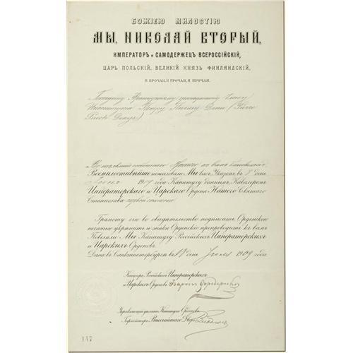 Awarding document of 1st class. Imperial Russian diploma to a French member of civil institute (Pierre Puech-Denys). Dated and signed in St-Petersburg on 18th of July, 1909. With original signatures of order's chancellor and of an order's official. In Russian languages and Cyrillic script. Four-sided sheet with certification of Russian embassy in Paris. Several times folded.