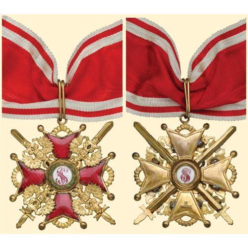 Cross 2nd Class with Swords. Neck badge, bronze gilt, averse enamelled, medallions painted, crossed swords, maker's mark (K/Eduard); with old wire suspension loop and later completed original ribbon. Very fine late war version with signs of wearing.